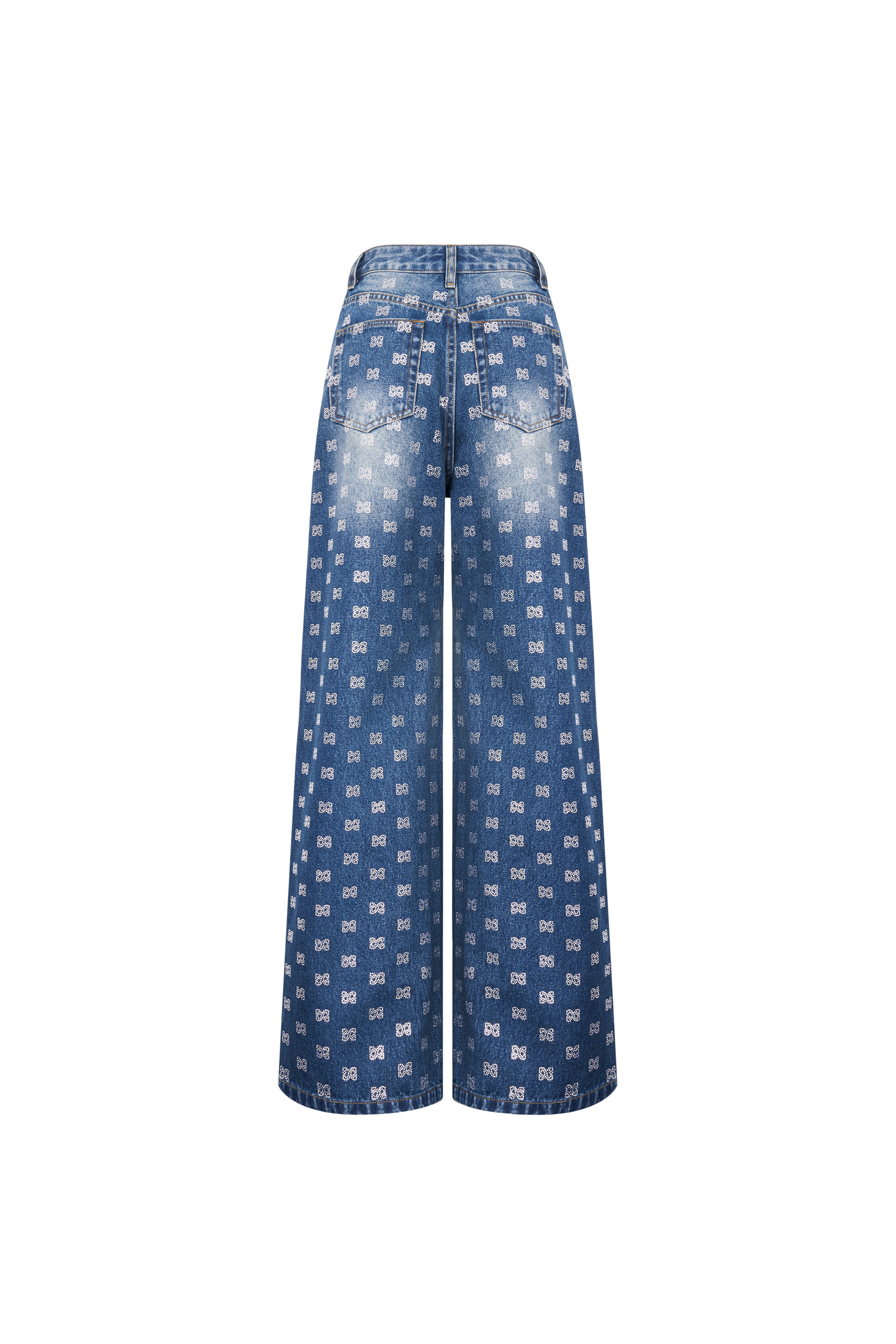 Blue Loose Straight-leg Full Rhinestone Logo Jeans