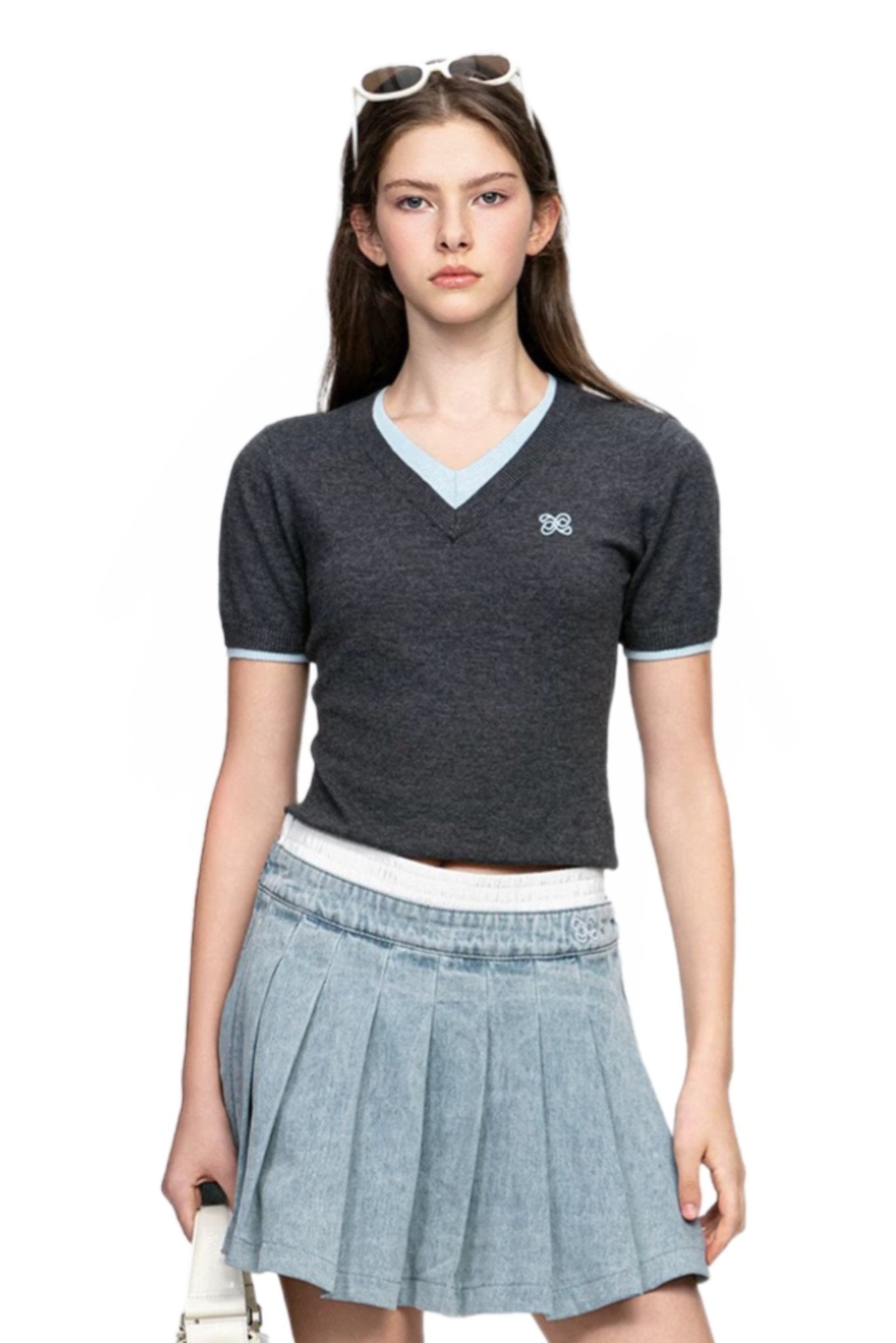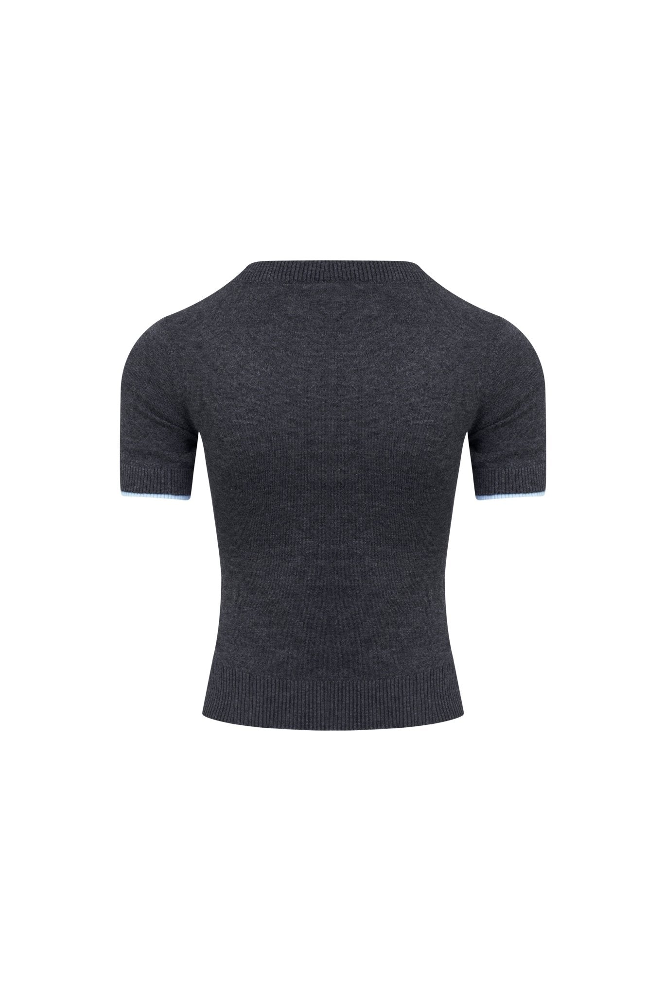 Dark Grey Double-Layered Contrast V-Neck Knitted T-Shirt