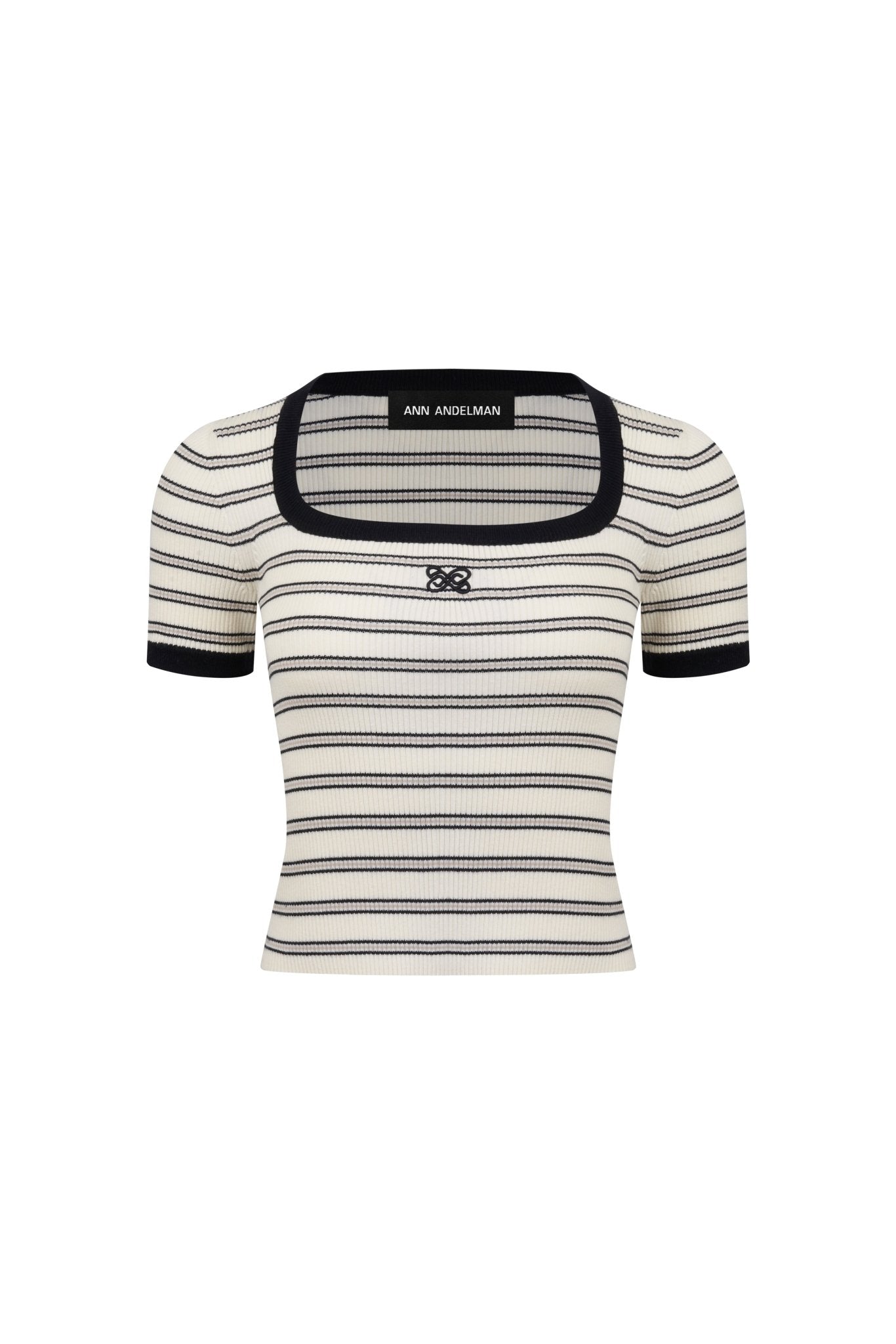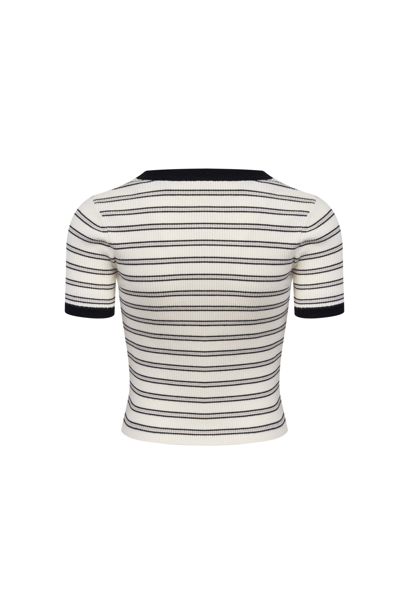 Light Apricot Square Collar Striped Knitted Short Sleeves