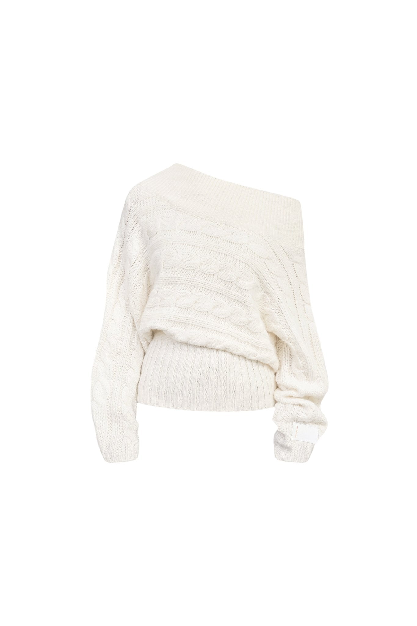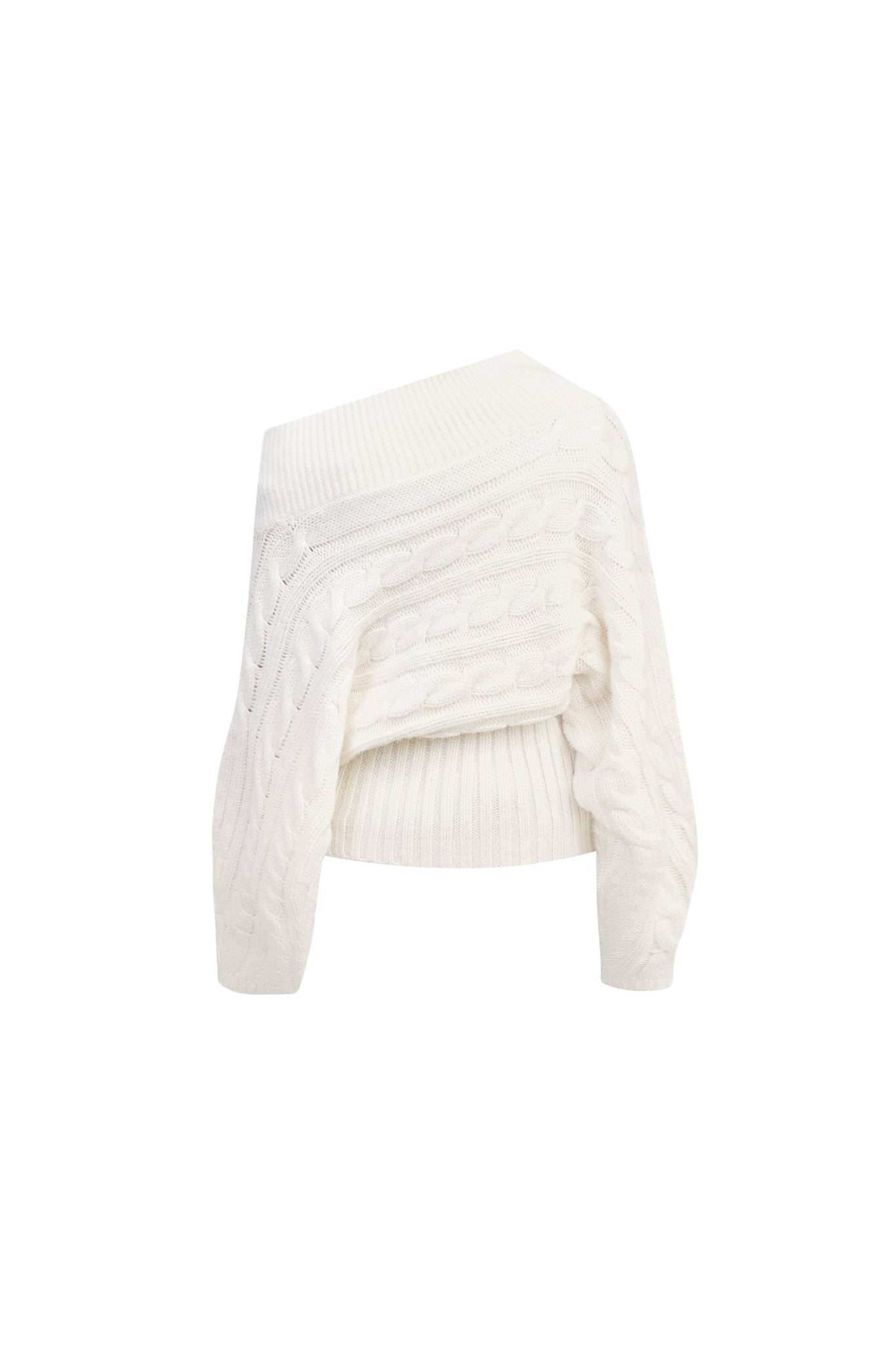 White Deconstructed Off-shoulder Cable Knit Sweater