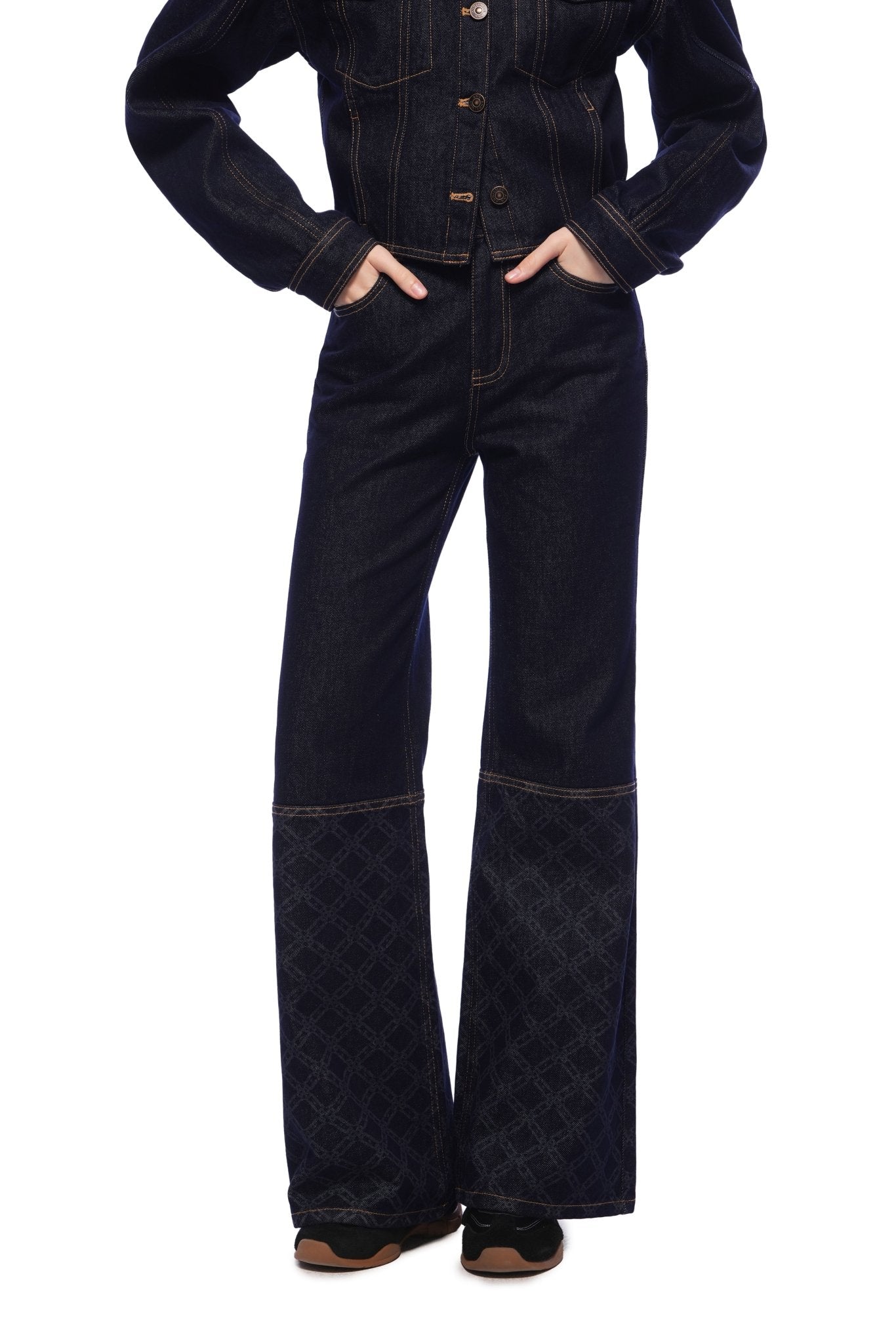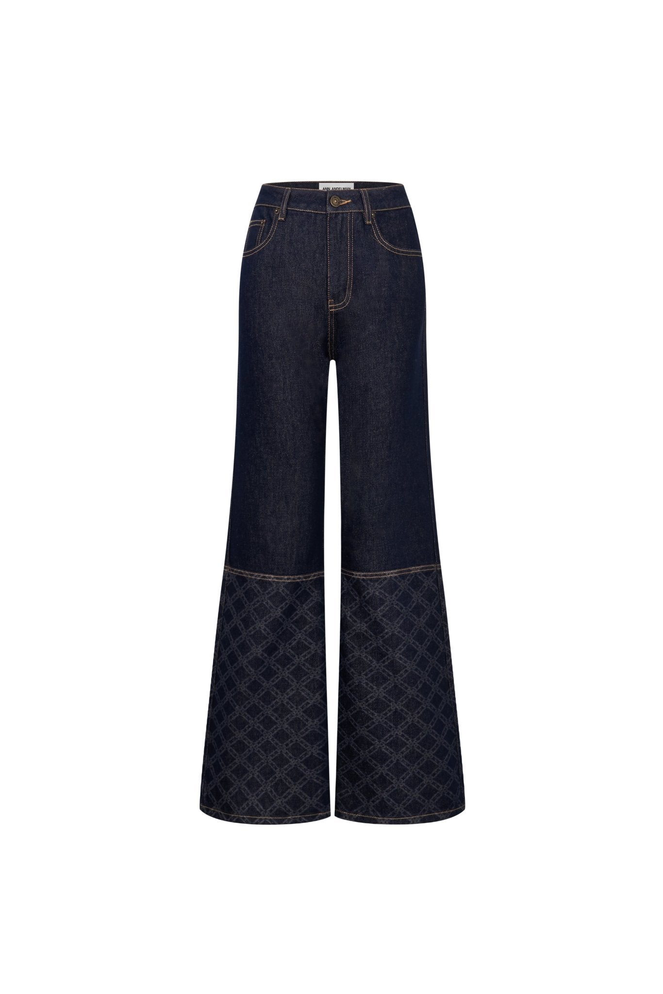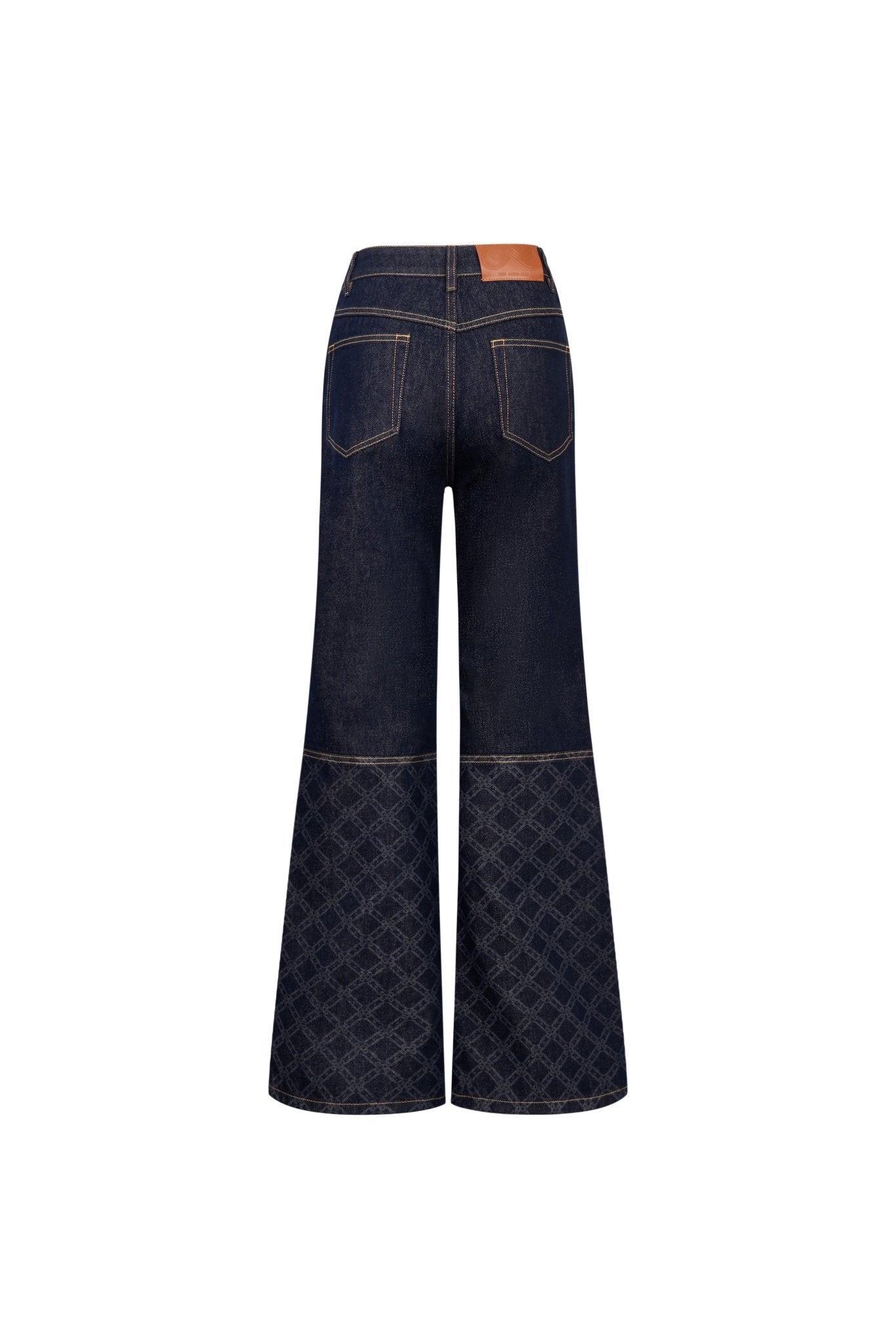 ダークブルーの生デニム、レーザーカットパッチワークフレアジーンズ