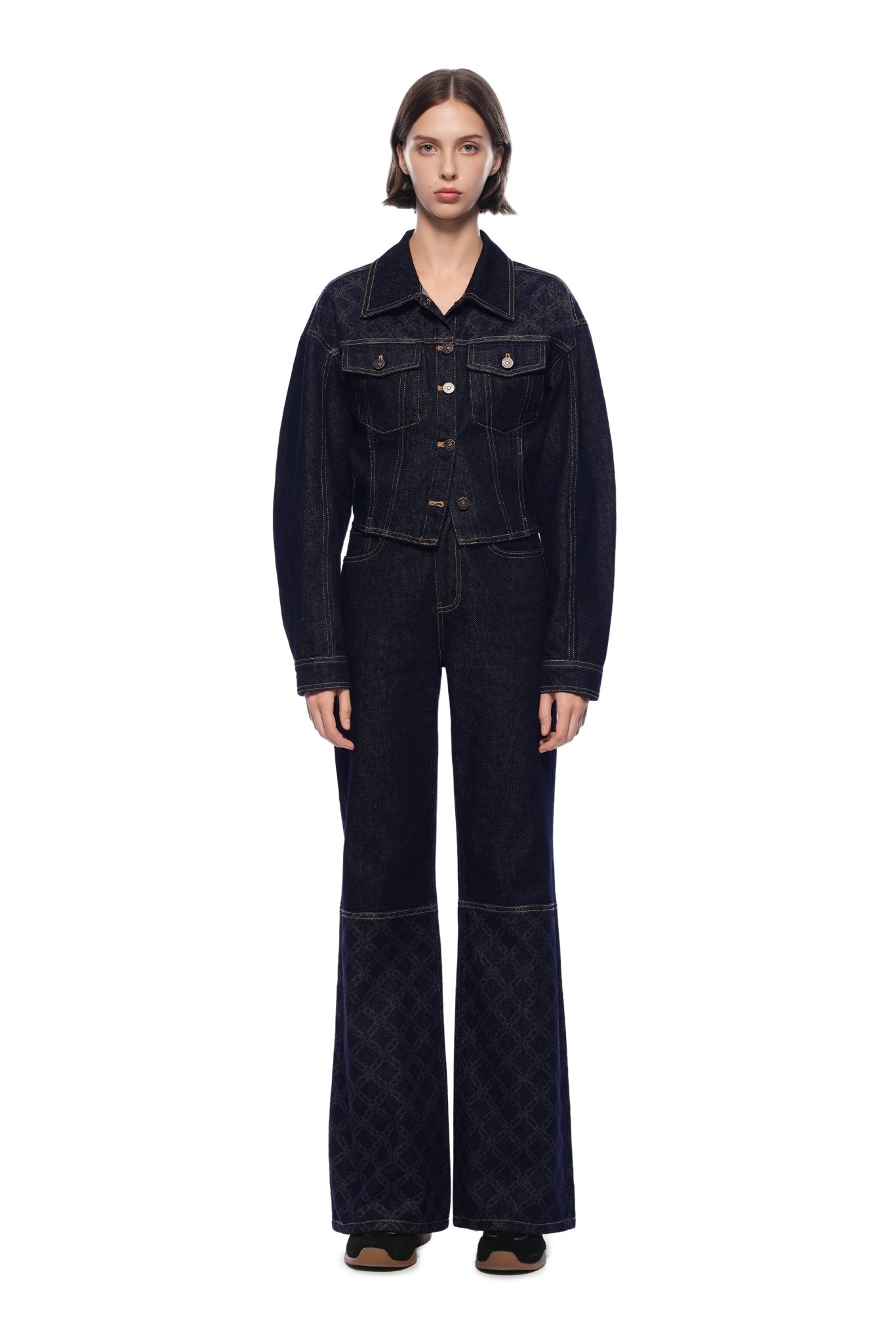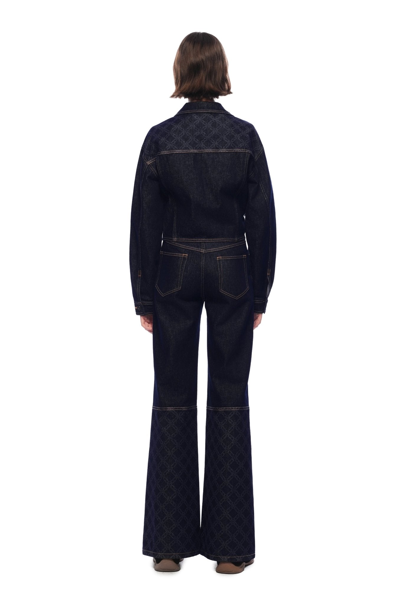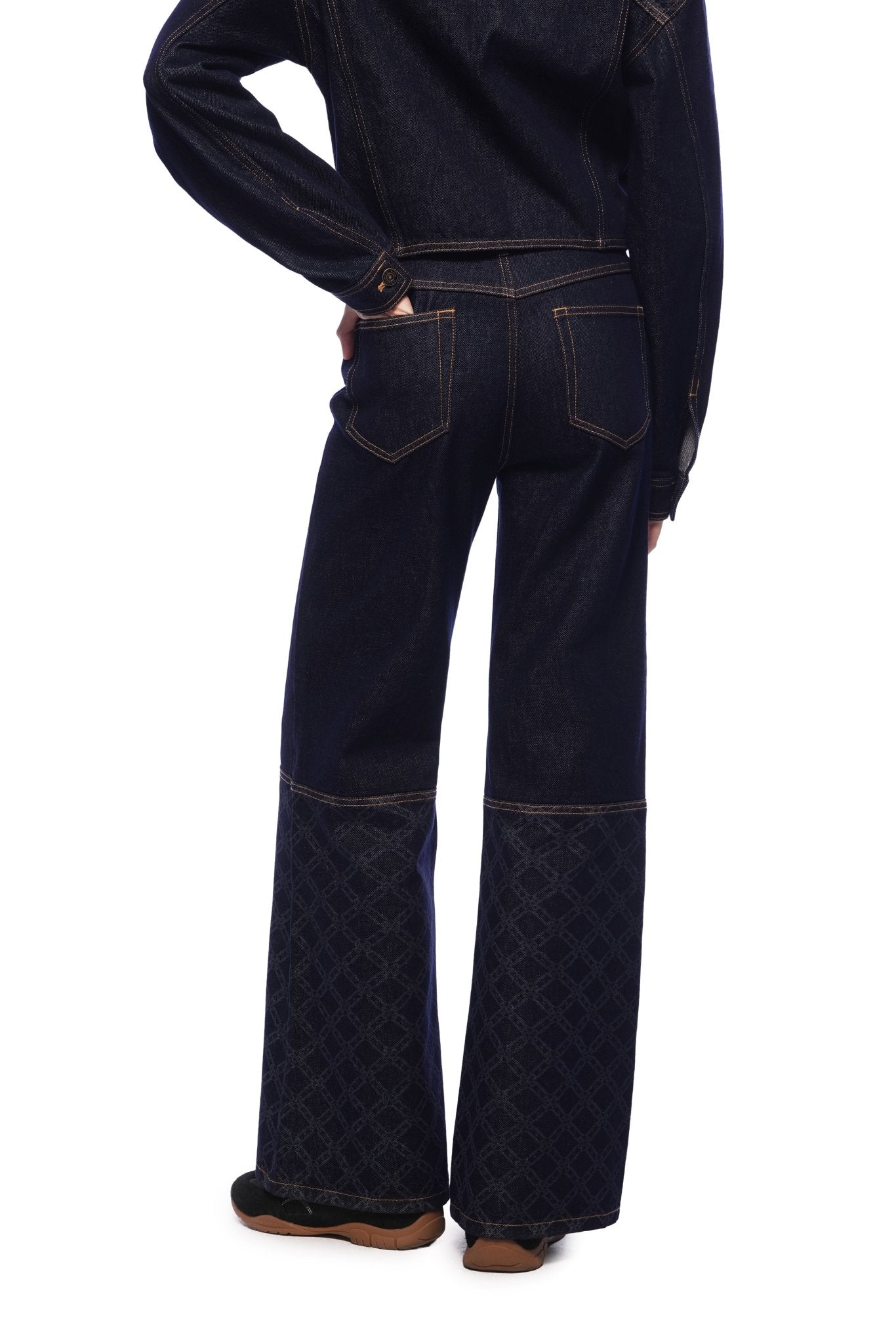 ダークブルーの生デニム、レーザーカットパッチワークフレアジーンズ