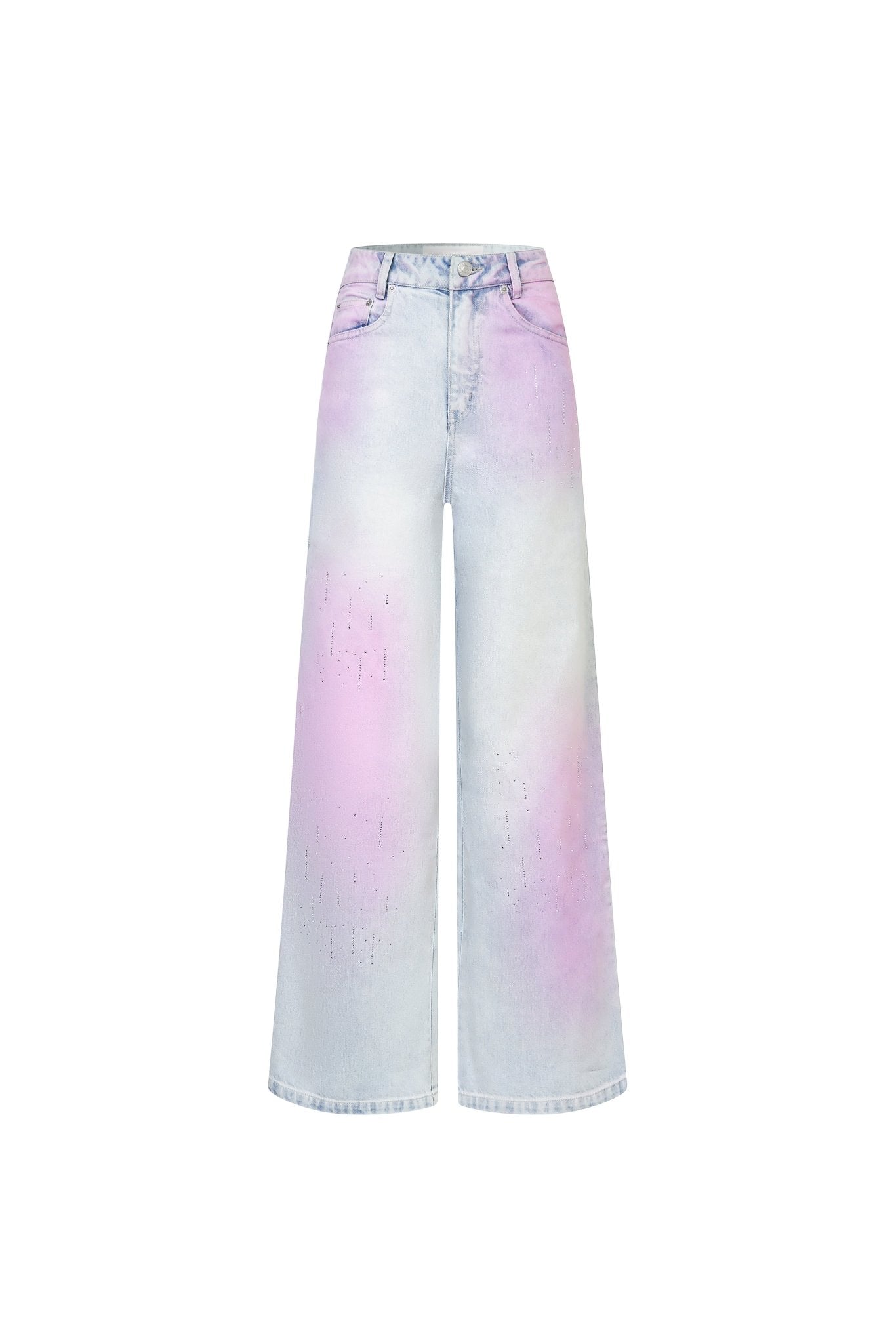 ライトブルーとピンクのグラデーションラインストーンストレートワイドレッグジーンズ