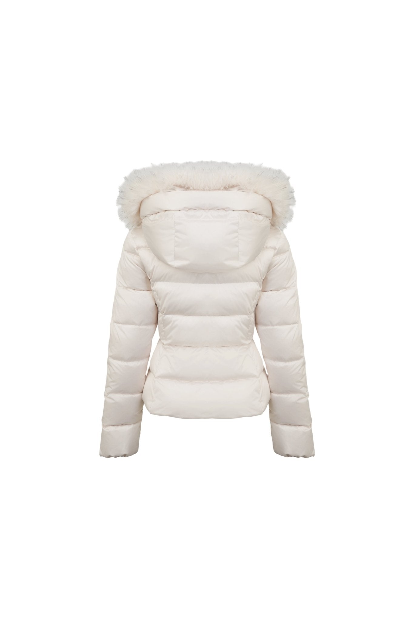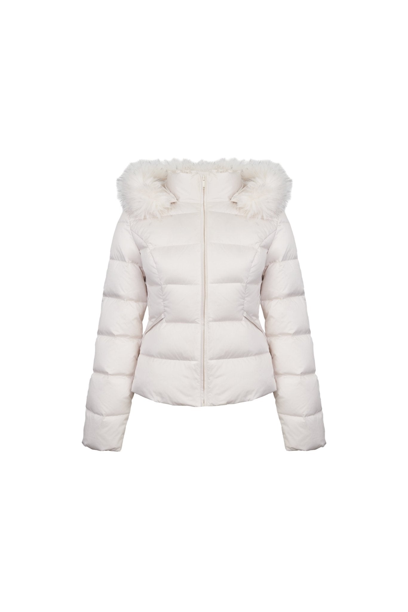 탈부착 가능한 모피 칼라와 몸에 꼭 맞는 허리가 있는 가벼운 살구색 다운 재킷